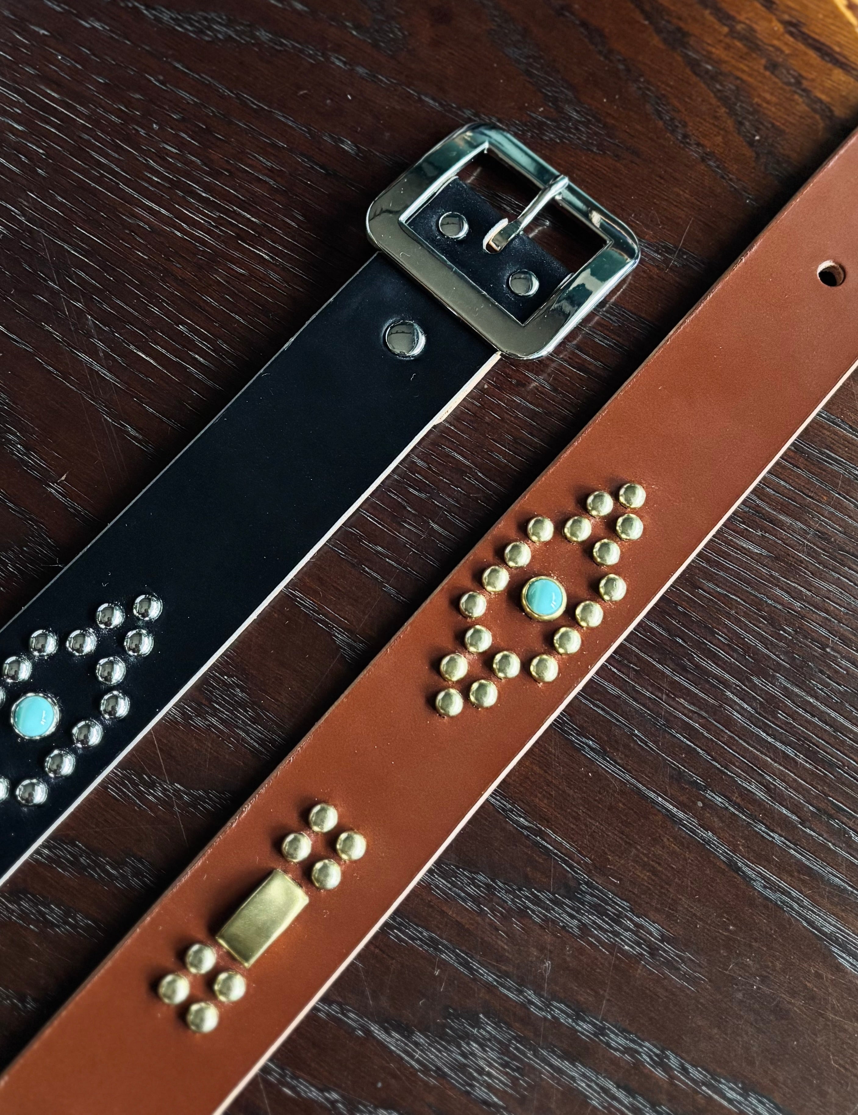 The hardware: Buckles are solid brass, made in Japan. One version being nickel plated. The studs are steel with brass or nickel plating.