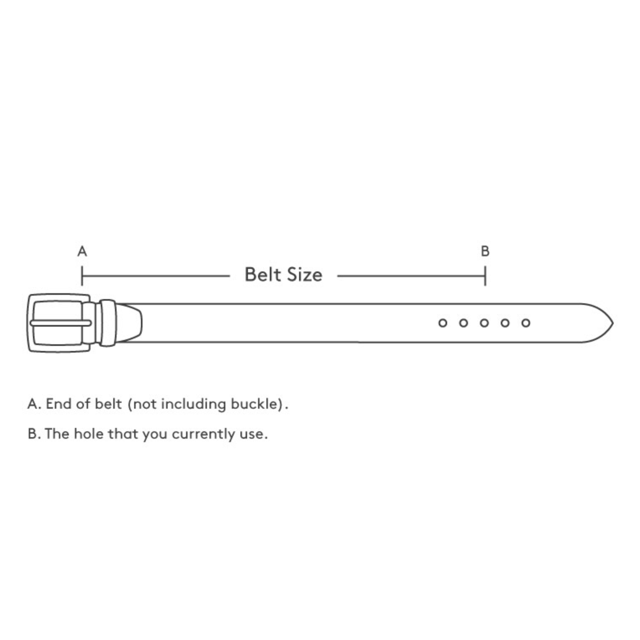 Sizing is taken from where the leather folds around the centre bar of the buckle to the middle hole. There are five holes set at 1 inch intervals. The size is not your waist size - it is the belt size. Typically a belt size would be between 1 and 2 inches bigger than your waist size. For best results measure an existing belt using the diagram below: