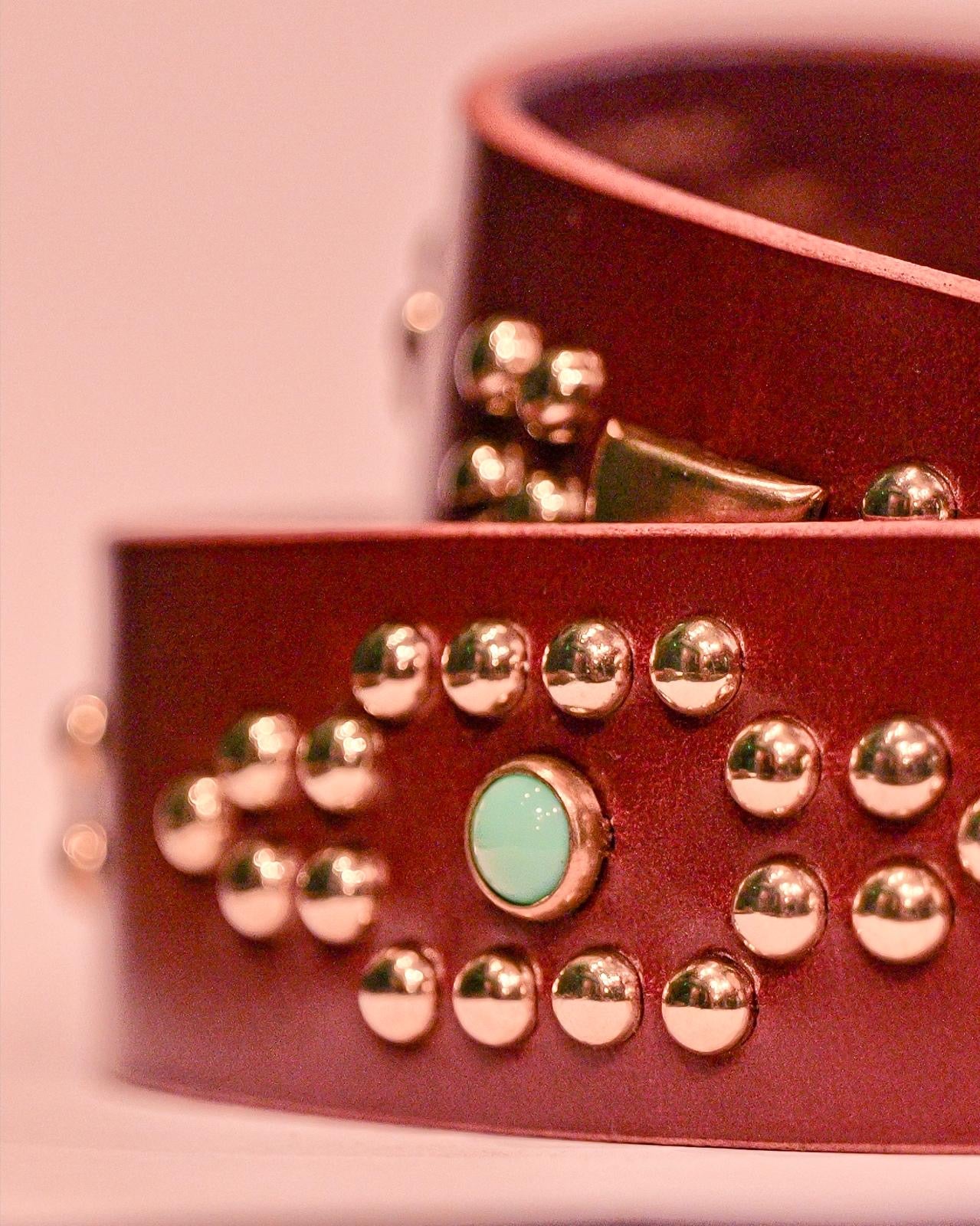 The belt is fasted by a clipped corner whole buckle made from nickel plated bass and is adorned with nickel plated steel studs. The jewels are antique turquoise glass made by Preciosa from the 1950s.