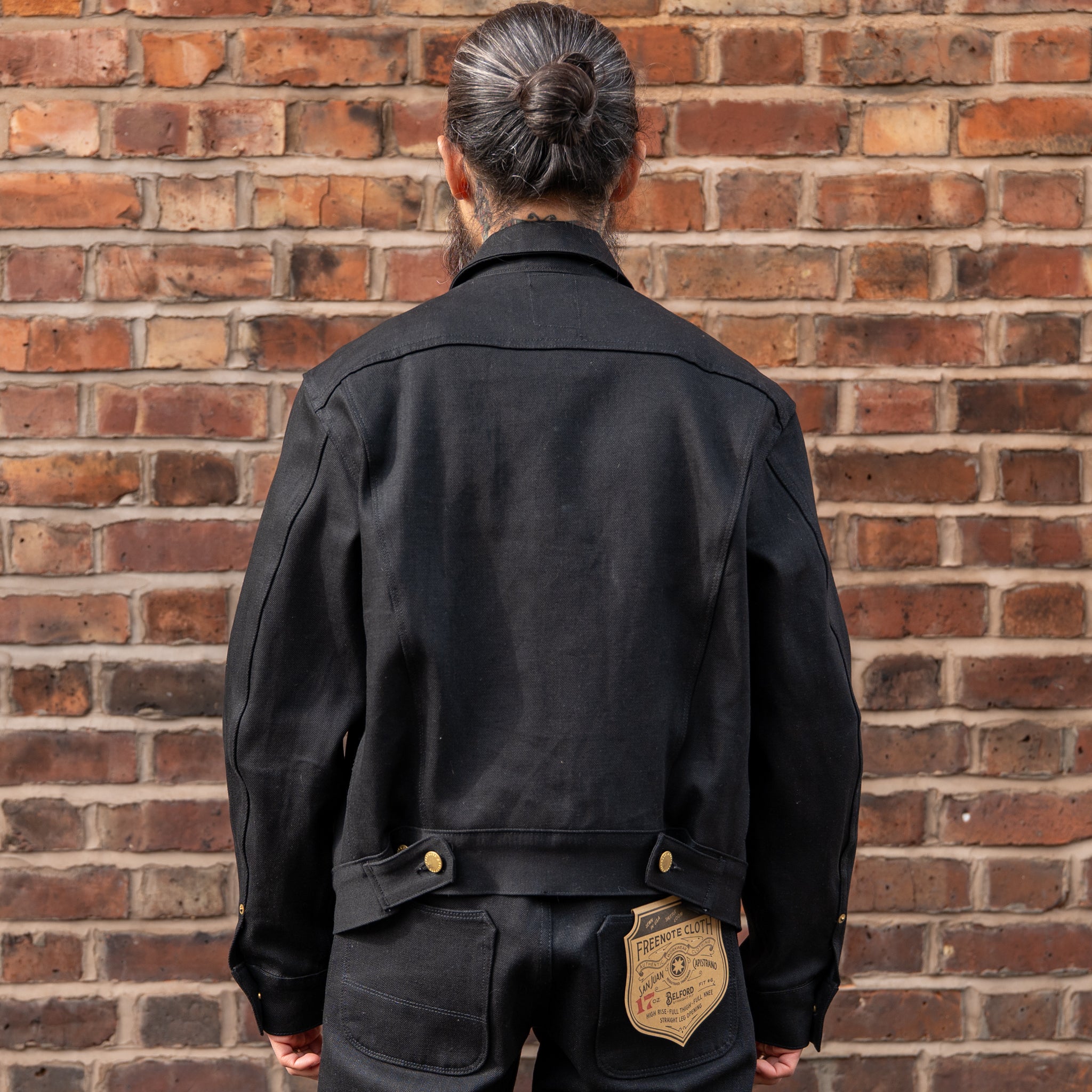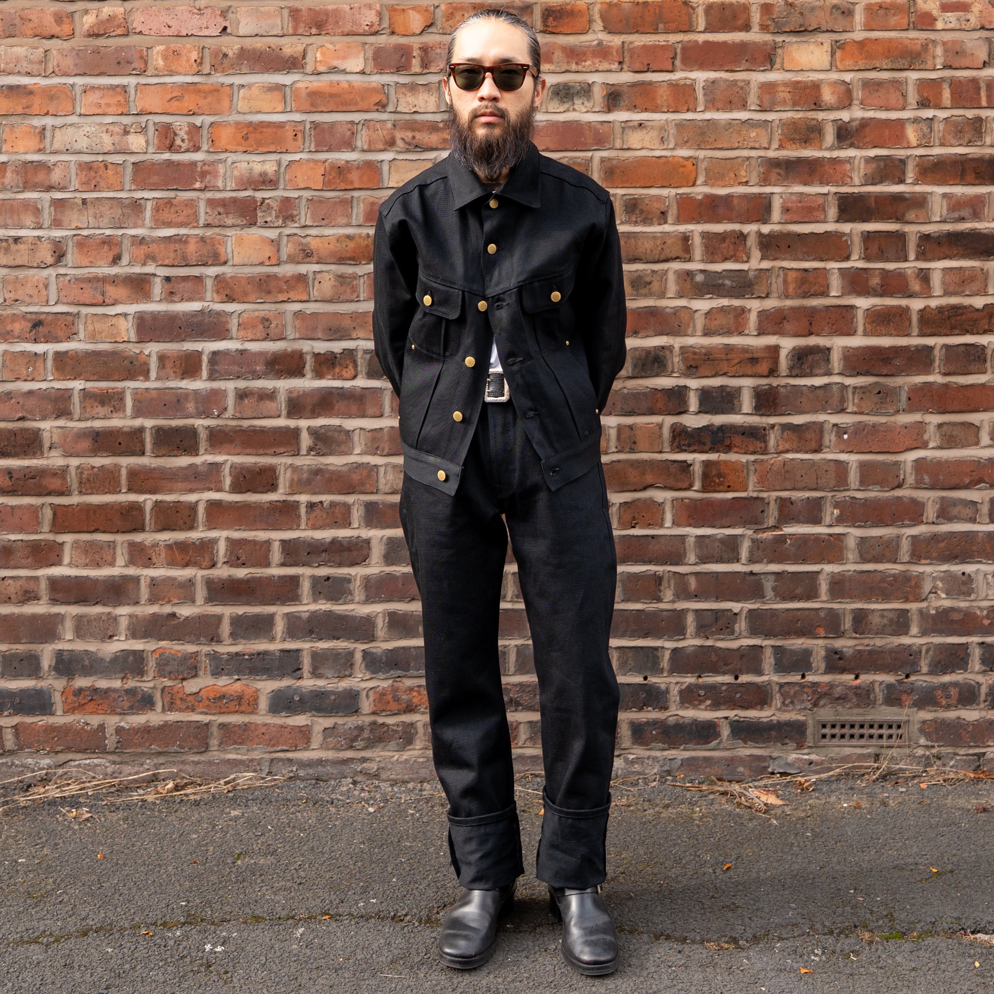 - Custom 14 ounce black black denim from Kaihara Mills, Japan