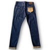 The jean features a slim thigh with a moderate leg opening. Made from the brands custom woven Japanese 13 oz rinsed denim, with a subtle brown weft on the underside of the blue indigo.