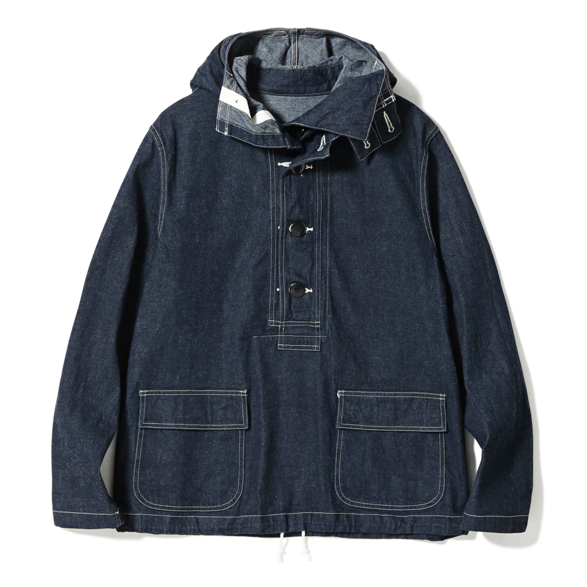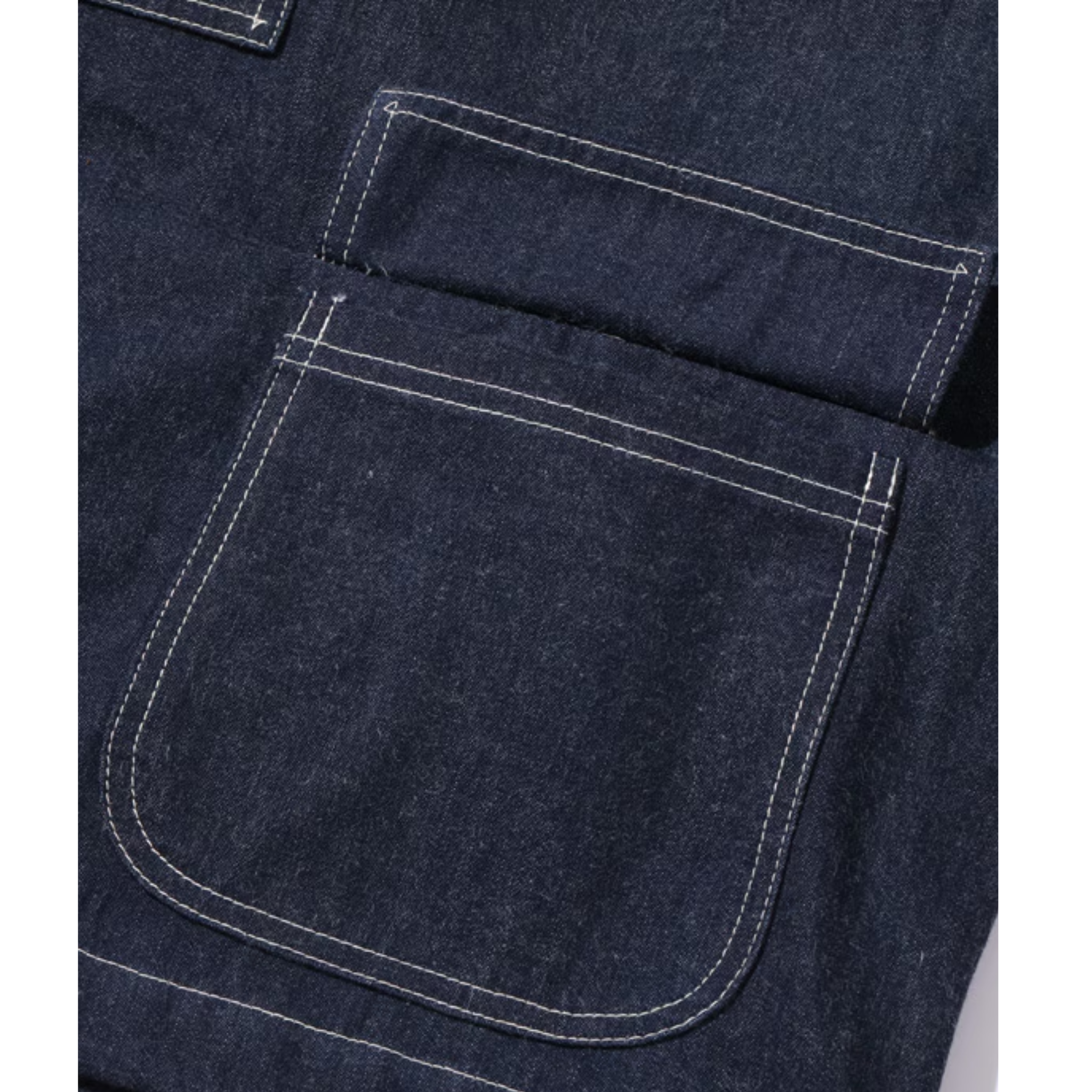 We see this more in line with a classic utilitarian smock so works as a perfect mid layer or as a lightweight jacket in warmer months. Made from a Japanese raw denim with contrast white stitching.