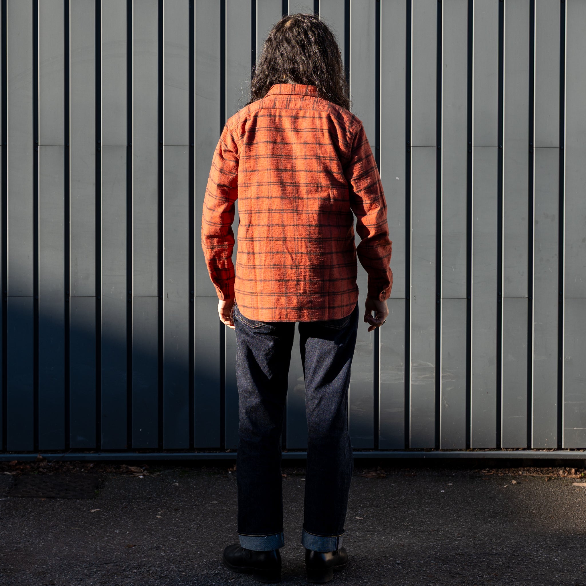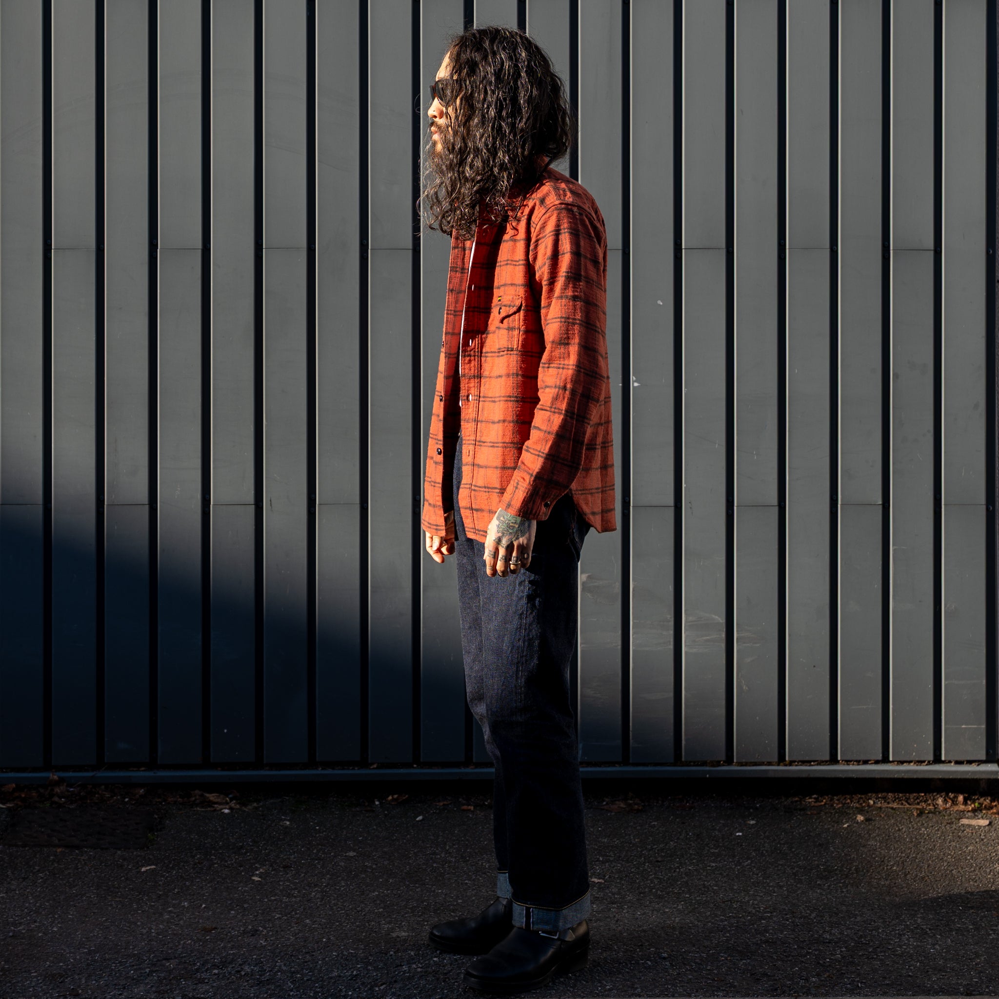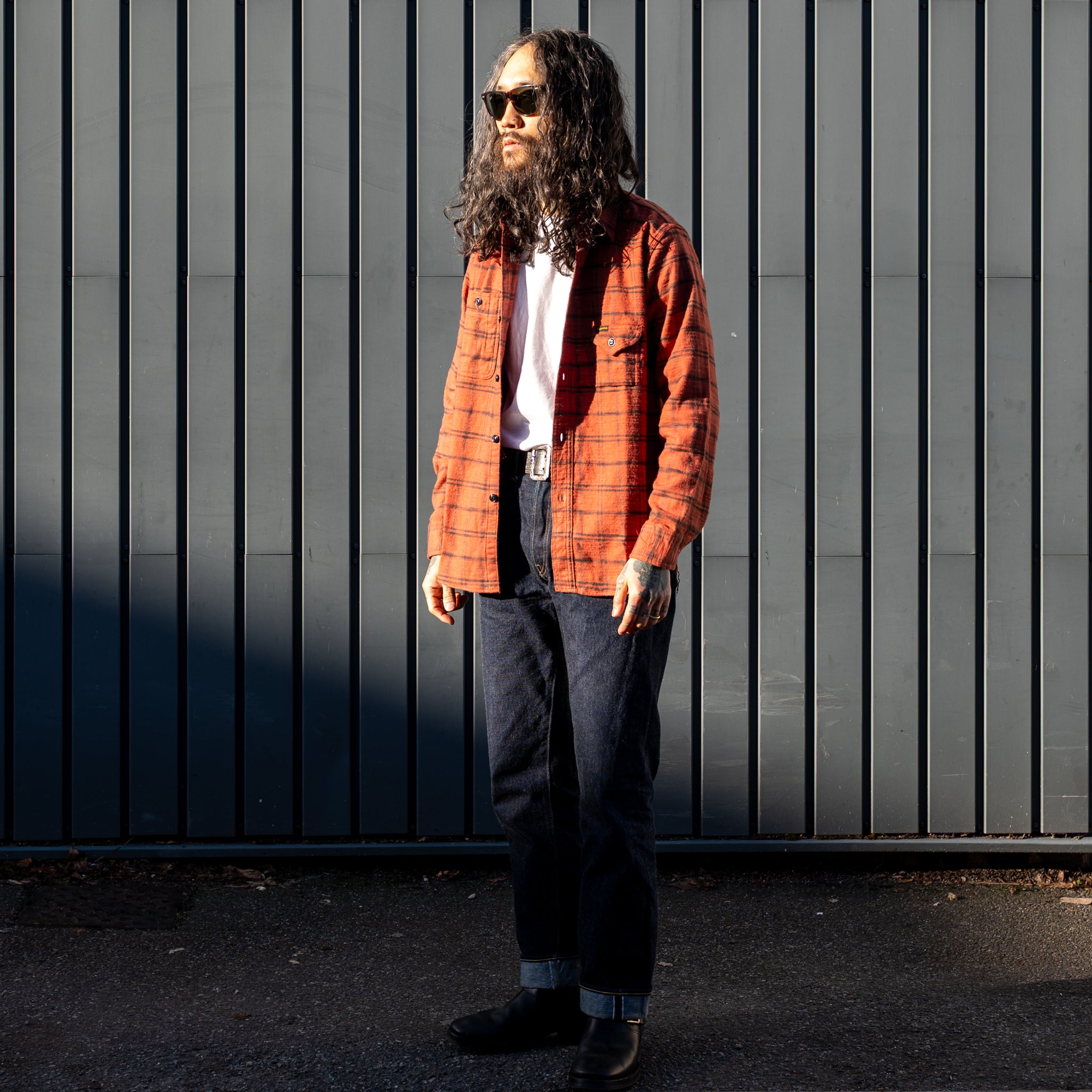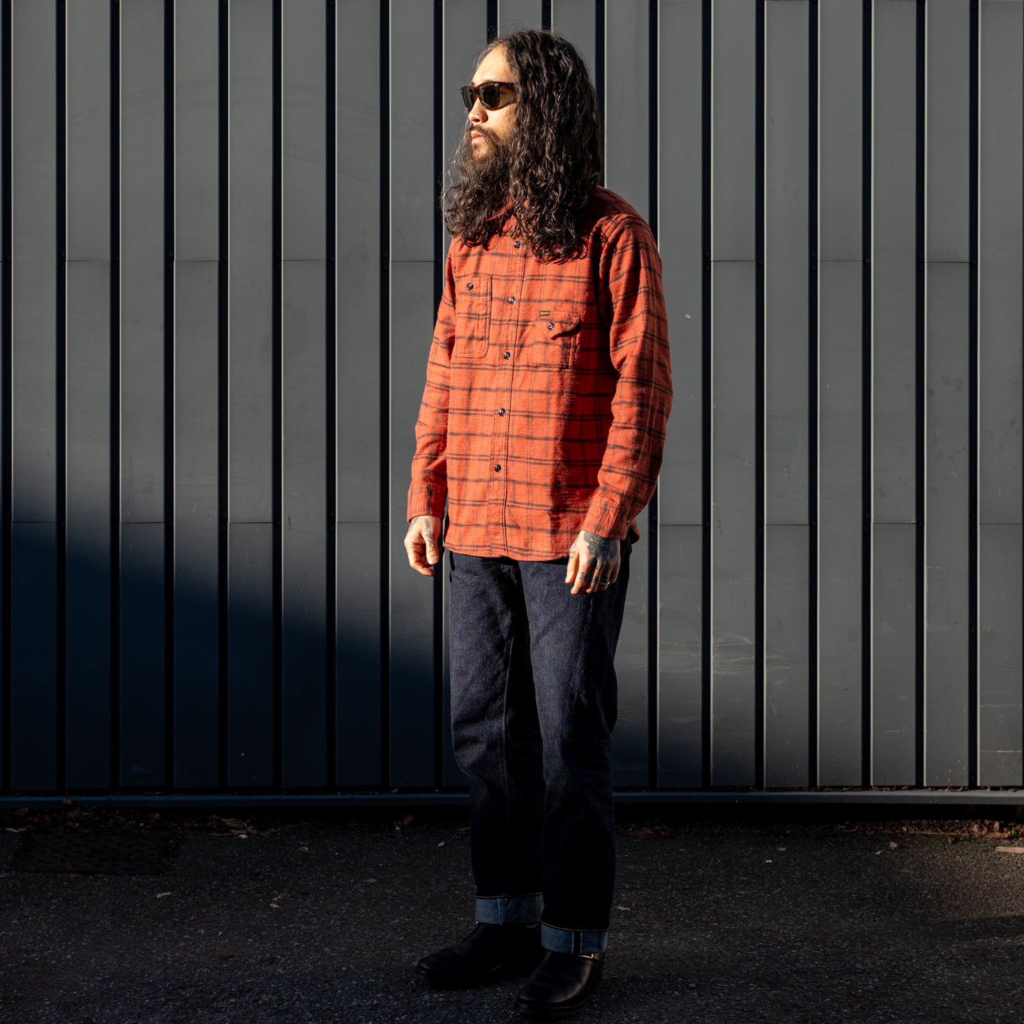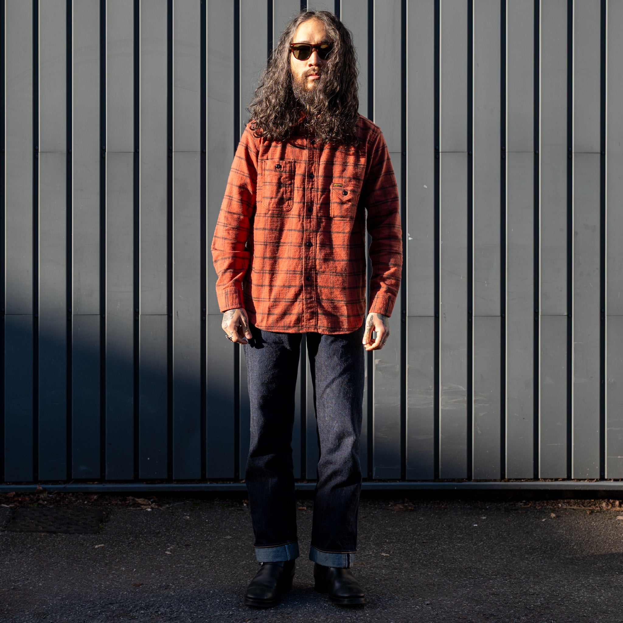 The Pherrow’s Flannel Work Shirt 24W-750WS-C channels the spirit of early 20th-century American workwear, featuring the distinctive “gacha pocket” design — an asymmetrical pocket layout inspired by 1930s originals.