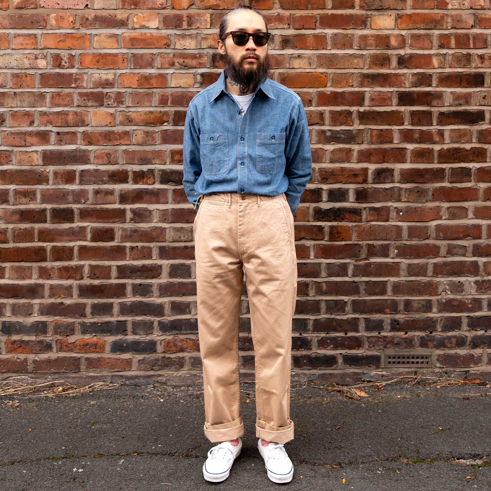 Crafted from authentic low-tension chambray, the fabric naturally shrinks and softens over time, developing a distinct texture unique to each wearer. Key period details include gussets at the hem, a stand-up collar, and a traditional placket — all hallmarks of classic Navy issue workwear.